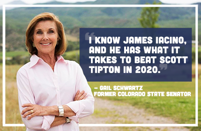 "I'm proud to endorse James Iacino, Democrat for Congress in Colorado’s 3rd district. A proven leader on sustainability, James also has the track record and solid business experience to help build an economy that works for everyone,” said Fmr. State Senator Gail Schwartz. “Having worked his way from the loading docks to running one of Colorado’s most successful businesses, we can trust James to look out for the hardworking families of Western and Southern Colorado. It is time for a strong voice in Washington who will stand up for the values of rural Colorado. I know James Iacino, and he has what it takes to beat Scott Tipton in 2020.”